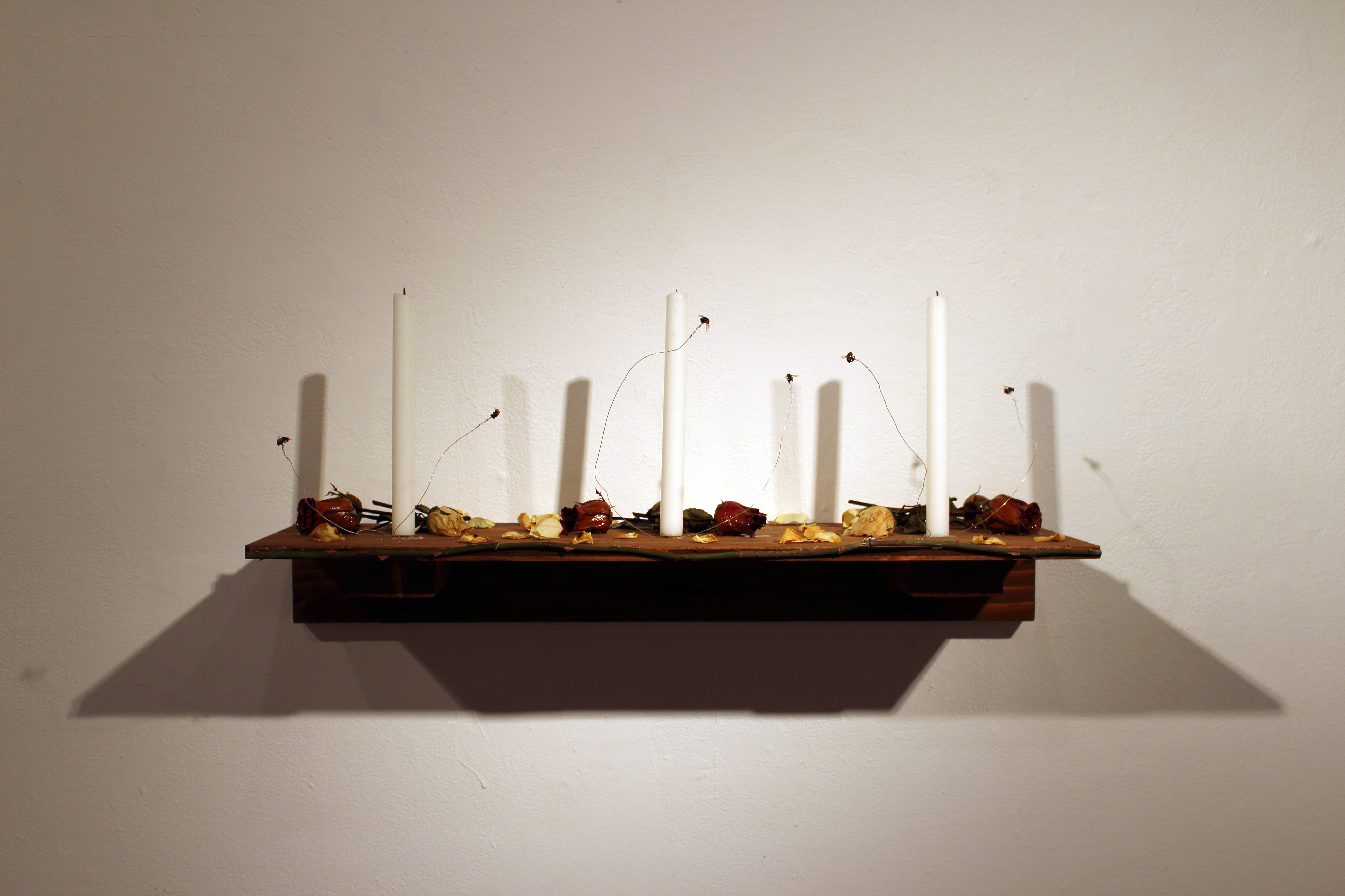 Untitled (Altar) Untitled (Altar) Dimensions Variable Dead Bees, Wire, Dead Roses, Acrylic Gel, Candles, Stain on Wood 2014
